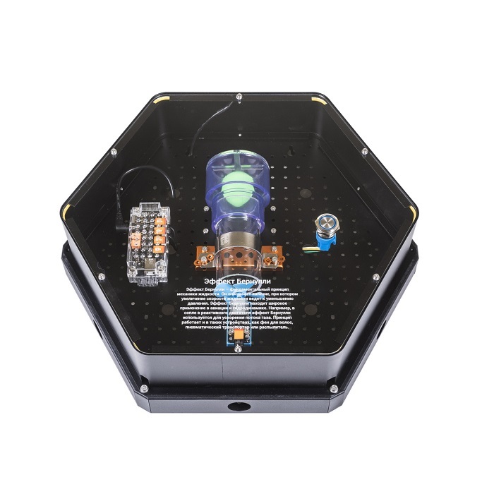 Интерактивный модуль для оформления зон рекреации, кабинетов, IT-полигона, библиотеки, медиа зоны. Модуль демонстрирует принцип Бернулли. Выполнен в форме шестиугольной призмы с интерактивным наполнением.