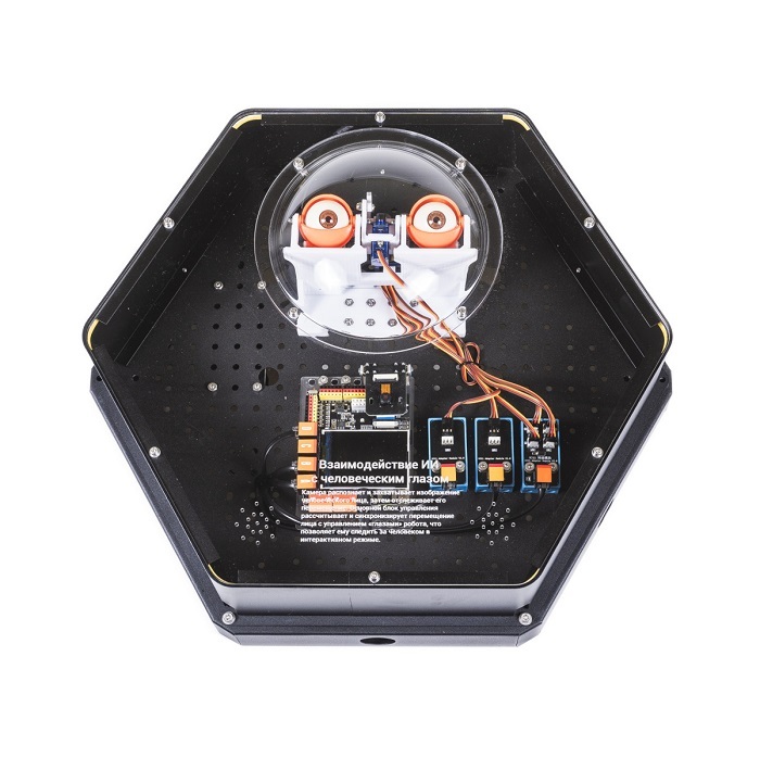 Интерактивный модуль для оформления зон рекреации, кабинетов, IT-полигона, библиотеки, медиа зоны. Модуль демонстрирует принцип работы cистемы распознавания действий человека на основе искусственного интеллекта. Выполнен в форме шестиугольной призмы с интерактивным наполнением.