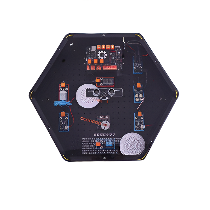Интерактивный модуль для оформления зон рекреации, кабинетов, IT-полигона, библиотеки, медиа зоны. Модуль позволяет смоделировать часто используемые в домашних условиях модули и датчики для реализации голосовых команд, голосовых трансляций, температуры и влажности, значений освещенности, громкости звука, изменений освещенности, имитации движения штор или окон, контроля вентиляции и температуры. Модуль выполнен в форме шестиугольной призмы с интерактивным наполнением.