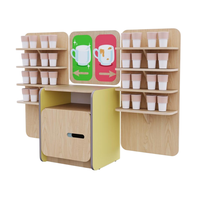 Набор для организации питьевого режима в детском саду: тумба для чайника, две навесные полки для кружек и табличка «Чистые и грязные кружки».
