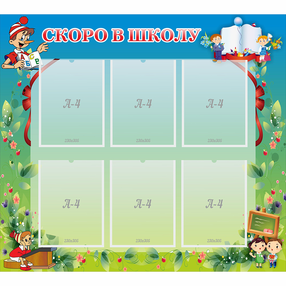 Стенд изготовлен из качественного материала, имеет удачное размещение информационных карманов. Лист можно заменить, потянув за край в правом верхнем углу. Размещение стенда будет актуальным в блоке подготовительной группы детского сада. Дети смогут найти на картинке Буратино с азбукой в руках, тетрадь с цветными карандашами, веселых первоклассников возле школьной доски.