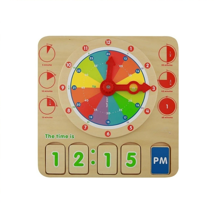 На панели представлен циферблат с минутной и часовой стрелкой, а в нижней части панели расположен слот для размещения деревянных карточек с отображением цифровых значений временных показателей. Красочная игрушка для обучения времени.